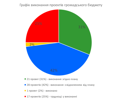 Відповідно до інформації, наданої розпорядниками коштів Громадського бюджету, станом на 22.05.2017 з шістдесяти семи проектів – переможців один проект вже виконаний, двадцять один проект перебуває на стадії виконання відповідно до календарного плану, реалізація двадцяти восьми проектів проходить з незначним відхиленням відповідно до календарного плану, у реалізації сімнадцяти проектів є відхилення відповідно до поданого календарного плану.